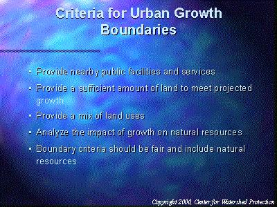 Urban Growth Boundaries: This planning technique establishes a dividing line between areas appropriate for urban and suburban development, and areas appropriate for agriculture, rural and resource protection. Boundaries are typically set up for a 10 or 20 year period and should be maintained for the duration of the life of the planning period. Boundaries may be examined at planning period renewal intervals to assess whether conditions have changed between planning cycles to ensure a consistent playing field for both the marketplace and citizens. Urban growth boundaries are sometimes called development service districts, and include areas where public service is already provided (e.g. sewer, water, roads, police, fire, and schools). The delineation of the boundary is very important.