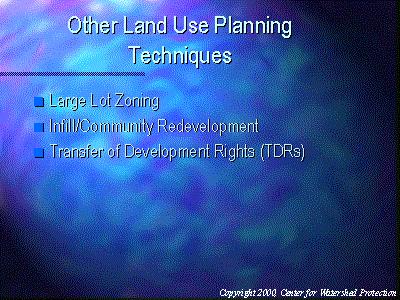 Transfer of Development Rights (TDRs): This land use management technique can support local comprehensive planning goals and facilitate Watershed Based Zoning proposals by transferring development potential from sensitive subwatersheds to subwatersheds designated for growth. The principle of TDRs is based on the premise that ownership of land entails certain property rights. While some of these rights may be restricted by zoning, building codes, environmental constraints, and the like, land owners are �entitled� to use their land for the �highest and best use.�