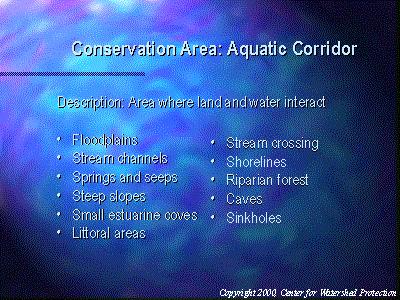 The aquatic corridor is the area where land and water meet. This can include floodplains, stream channels, springs and seeps, small estuarine coves, littoral areas, stream crossings, shorelines, riparian forest, caves, and sinkholes.