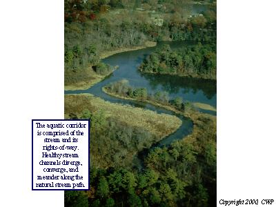 The aquatic corridor is comprised of the stream and its rights-of-way. Healthy stream channels diverge, converge, and meander along the natural stream path.