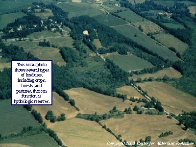 This aerial photo shows several types of land uses, including crops, forests, and pastures, that can function as hydrologic reserves.