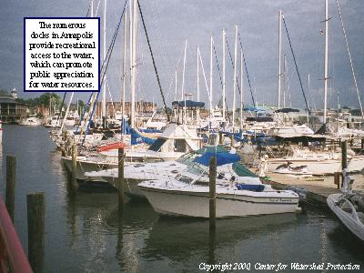The numerous docks in Annapolis provide recreational access to the water, which can promote public appreciation for water resources.