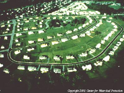 This aerial shows a typical residential development with large lots and setbacks, which contributes to urban sprawl.