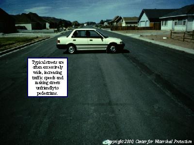 Typical streets are often excessively wide, increasing traffic speeds and making streets unfriendly to pedestrians.