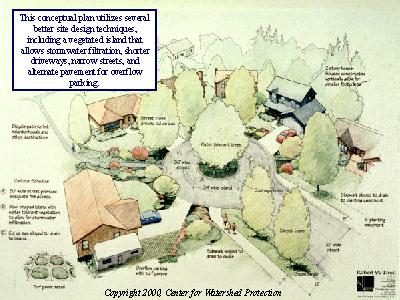 This conceptual plan utilizes several better site design techniques, including a vegetated island that allows stormwater filtration, shorter driveways, narrow streets, and alternate pavement for overflow parking.