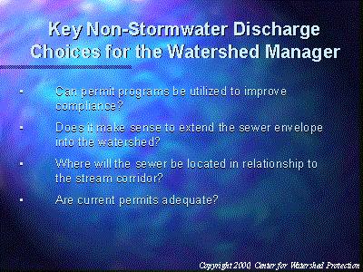 Watershed managers should address all these key issues on non-stormwater discharges. One of the first priorities for a watershed manager is to conduct a quick inventory of the nature and extent of non-stormwater discharges in the subwatershed. If non-stormwater discharges appear to be a problem, a watershed manager may need to conduct a subwatershed survey. This usually involves a survey of the largest or most common wastewater discharges within the subwatershed, with a strong emphasis on how wastewater is actually conveyed within the subwatershed (i.e. sanitary sewer, septic systems, etc.).