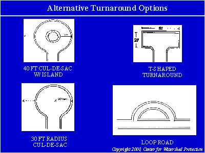 Alternative turnaround options include a loop road and a t-shaped (also called a hammerhead) turnaround. Loop roads are semi-circular and provide two points of entry and exit, serving twice as many residential units as compared to cul-de-sacs (Bucks County, 1980). Hammerheads generate 75% less impervious cover than a 40 foot cul-de-sac but are generally only applied when streets are less than 200 feet long or when lot sizes are very large.