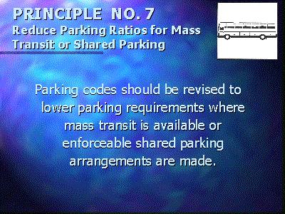 Few communities require or encourage developers to reduce the number of parking spaces built based on availability of mass transit or opportunities for shared parking. Mass transit can reduce the demand for individual vehicles subsequently reducing the number of parking spaces required. Shared parking allows adjacent land uses to share parking lots if peak parking demands occur during different times of the week.