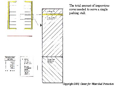 A parking stall is supported by a larger parking space that includes the (a) overhang, (b) curb, (c) stall, (d) parking aisle needed to get into the stall, and (e) the stall�s share of common parking area, such as entrances, internal collectors, fire lanes and handicapped parking spaces. When these extra features are added in, the approximately 180 square feet needed for each parking stall increases to over 400 square feet.