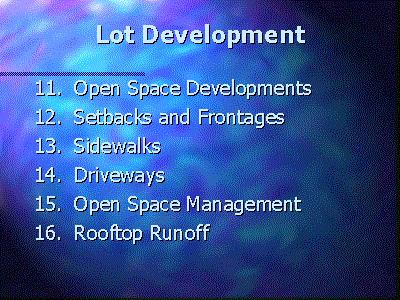 In residential lot development, many opportunities exist to reduce impervious cover by modifying shape, size, and layout of the residential lots. Perhaps the greatest opportunities involve a shift to open space developments.