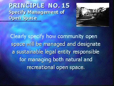 Open space maintained in a natural condition has a minimal annual maintenance cost, and communities should encourage developers to retain as much natural open space as possible. Communities should explore more reliable methods to assure that responsibility for open space management can be met within a development by creating a community association or shifting responsibility to a land trust or park through a conservation easement.