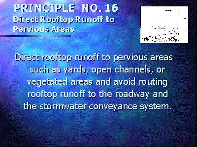 Sending rooftop runoff over a pervious surface before it reaches an impervious one can decrease the annual runoff volume from residential development sites by as much as 50%. Some possible techniques to encourage treatment of rooftop runoff on-site include directing flow into stormwater treatment practices (infiltration swales, infiltration trenches, or dry wells), encouraging sheet flow through vegetated areas, directing runoff to depression storage areas, or using a rain barrel.