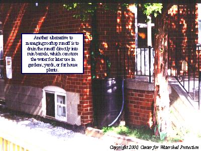 Another alternative to managing rooftop runoff is to drain the runoff directly into rain barrels, which can store the water for later use in gardens, yards, or for house plants.