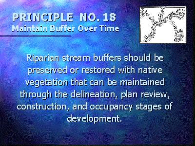 While the establishment of a buffer is paramount to better site design, assuring that the buffer is safeguarded from clear cutting and maintained is just as essential. Many communities have stream buffer ordinances, but a line drawn on a map or plan is virtually invisible to contractors and landowners. Few communities require that buffer lines be marked in the field. A strong buffer ordinance should outline the legal rights and responsibilities for management and maintenance during construction and for the long-term. An effective buffer program should also address who is responsible for these issues and how to reestablish buffers.