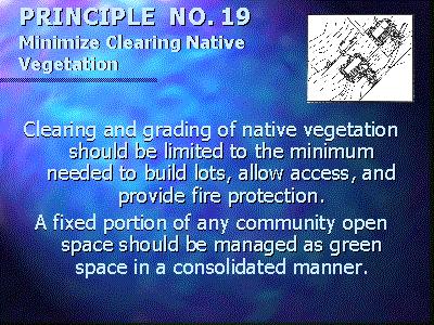 Most communities allow clearing and grading of an entire development site, with a few exceptions for regulated areas such as jurisdictional wetlands, steep slopes, and floodplains. The preservation of natural areas helps balance the impacts of development by maintaining the natural hydrologic cycle and limiting the amount of disturbed soils. Clearing should be limited to the minimum area required for building footprints, construction access, and safety setbacks. Existing tools that could be adapted to limit clearing include erosion and sediment control ordinances, grading ordinances, forest conservation or tree protection ordinances, and open space development.