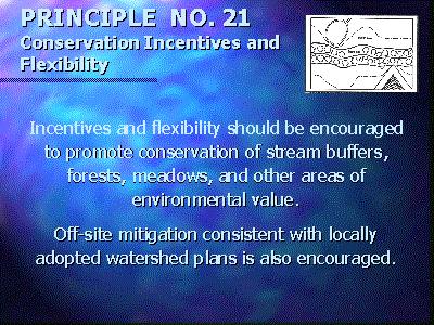 A limited number of communities require conservation and protection of non-regulated areas such as stream buffers, forests, and meadows. Even fewer provide incentives for developers to consider better site design techniques that promote preservation of natural areas. Conservation of natural areas at the site level can be made a more attractive option through flexibility and incentives to developers to apply many of the principles identified here. Some methods to encourage conservation include open space development, reduced stormwater management requirements for environmentally sensitive developments, buffer averaging, property tax credits, density bonuses, and transferable development rights.