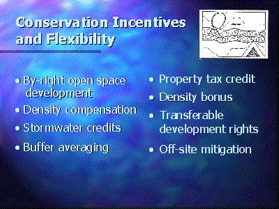 There are several ways to encourage conservation. including promoting by-right open space development which eliminates the special approval process required by many communities to utilize open space.