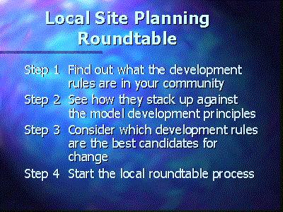 The twenty-two model development principles are designed to be used by planners, developers, and local officials as benchmarks to provide design guidance for economically viable, yet environmentally sensitive development. A four-step process is recommended to adapt local development rules to more closely conform to the model development principles.