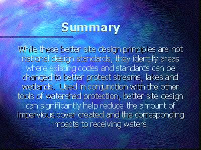 Assessment of local development rules using the codes and ordinance worksheet is one of the best ways for communities to determine how the 22 model development principles would apply. Not all of the principles will apply to every community and achieving one principle may require foregoing another. It is important to remember that while these principles are not national design standards, they identify areas where existing codes and standards can be changed to better protect streams, lakes and wetlands. Used in conjunction with the other tools of watershed protection, it can significantly help reduce the amount of impervious cover created and the corresponding impacts to receiving waters.