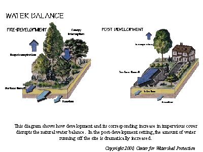 This diagram shows how development and its corresponding increase in impervious cover disrupts the natural water balance. In the post-development setting, the amount of water running off the site is dramatically increased.