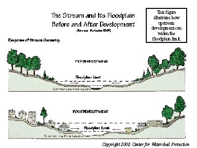 This figure shows how upstream development can widen the floodplain limit and is usually accompanied by encroachment into a larger floodplain.