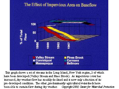 One example is a set of streams in the Long Island, New York region. The graph shows the predominantly agricultural watersheds that have been able to sustain flow during dry weather. Two streams, the Valley Stream and Pines Brook shown on the bottom, have steadily developed over time. As impervious cover has increased, dry weather flow in the streams has steadily declined and is now only a fraction of its pre-developed condition.