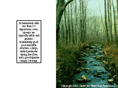 The Maryland Piedmont presents numerous examples of the different ranges of the enlargement process. An undeveloped watershed with less than 5% impervious cover is characterized by excellent stream conditions� good riparian cover, high quality substrate, and wetted perimeter during low flow conditions.