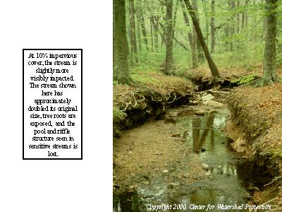 At approximately 10% impervious cover, the stream is slightly more visibly impacted. The stream shown here has approximately doubled from its original predevelopment size and evidence of changes includes downcutting, exposed tree roots, and loss of the pool and riffle structure.