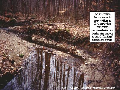 Active erosion becomes much more evident at 20% impervious cover with decreased substrate quality due to more material "flushing" through the system.