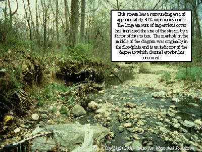 At 30% impervious cover, the stream structure becomes effectively blown out. The large amount of impervious cover has increased the size of the stream five- to ten-fold. The manhole in the middle of the diagram was originally in the floodplain and is an indicator of the degree to which channel erosion has occurred.