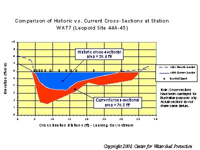 This graph illustrates the historic channel enlargement and incision that occurred in Watts Branch, Maryland from 1961 to 1999, which coincided with increased development.