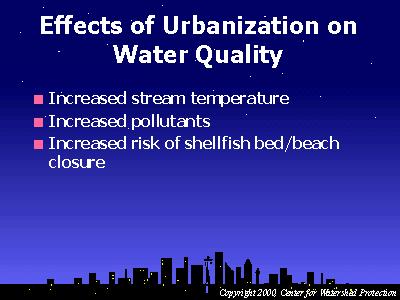 In addition to hydrologic and geomorphologic changes to the stream, urbanization directly impacts the quality of the receiving water. Some of the indicators of the impact of urbanization on water quality include increased stream temperature and pollutants.