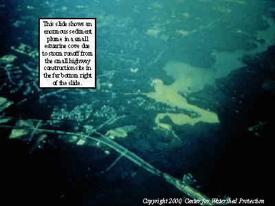 This slide shows an enormous sediment plume in a small estuarine cove due to storm runoff from the small highway construction site in the far bottom right of the slide.
