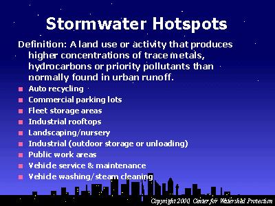 Stormwater hotspots are areas which produce higher concentrations of pollutants than normally found in urban runoff. Certain areas of the urban landscape are known to be hotspots of stormwater pollution. Examples include gas stations, parking lots, and auto recycling facilities. Generally, stormwater hotspots contribute 5 to 10 times higher concentrations of trace metals and hydrocarbons in stormwater runoff. These hotspots merit special management and pollution prevention activities.