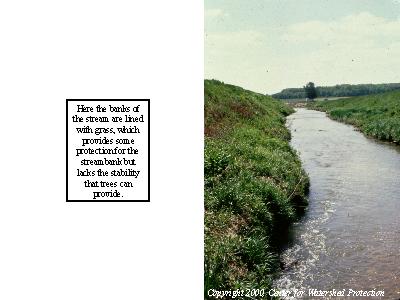 Here the banks of the stream are lined with grass, which provides some protection for the streambank but lacks the stability that trees can provide.