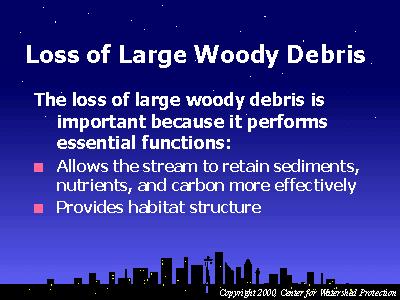 One of the most apparent changes to habitat in urban streams is the dramatic loss of large woody debris (LWD). LWD is important in a stream because it provides habitat structure and allows the stream to retain sediments, nutrients, and carbon more effectively. In urban streams, the increased stormwater flows and narrower riparian zones provide less large woody debris.