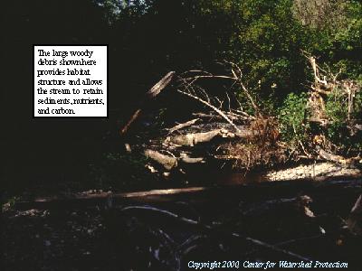 The large woody debris shown here provides habitat structure and allows the stream to retain sediments, nutrients, and carbon.