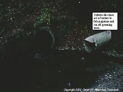 The creation of fish barriers is another impact of urban development. Barriers can prevent the movement of both anadramous and resident fish. In some cases, the fish barriers are created by culverts that are put in stream crossings for roads and other urban infrastructure. As the stream erodes down, vertical barriers to fish movement are created that cut off spawning areas. Menhaden, herring, striped bass, or salmonoids that are trying to move up to fresh waters to spawn in spring will likely encounter fish barriers that they cannot surmount. In many areas of the East Coast as well as the West Coast where salmon spawn, fish barriers are a major biological problem associated with urban development.