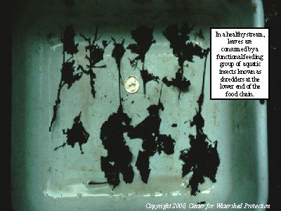The leaf packs are colonized by bacteria and the energy contained within them is consumed by a functional feeding group of aquatic insects known as shredders. Shredders are at the lower end of the food chain and are often absent in urban streams.