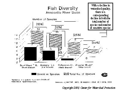 With a decline in watershed quality, there is a corresponding decline in both the total number of aquatic species and number of sensitive species. This is illustrated by an examination of four small watersheds in the Anacostia. The impervious cover of the four watersheds is as follows: Good Hope watershed at 10%, Nursery Run at 12%, Hollywood Branch at 25%, and Wheaton Branch at 55%. As can be seen, half the fish community is lost at 25% impervious cover and is down to two fish species at 55% impervious cover. The same finding has been replicated in many other regions of the country.