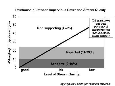This graph shows that as the percentage of impervious cover increases, the amount of sensitive aquatic biota decreases. At less than 10% impervious cover, streams are considered sensitive. Between 10-25%, streams are categorized as impacted. At levels greater than 25% impervious cover, streams are considered non-supporting.