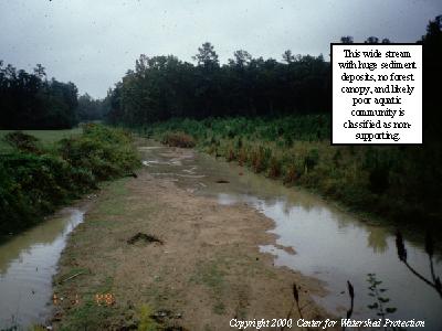This wide stream with huge sediment deposits, no forest canopy, and likely poor aquatic community is classified as non-supporting.