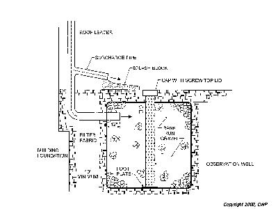 A variation of the infiltration trench is the dry well which can be effectively used to accept rooftop runoff, as indicated in this schematic. Dry wells can be effective practices at reducing total runoff volume from a site. Note the inherent problem of no pretreatment, depending on the roof surface, this can be either a minor problem or a potential for premature failure (i.e., asphalt shingles contain a sizable solid load that will eventually clog the practice).