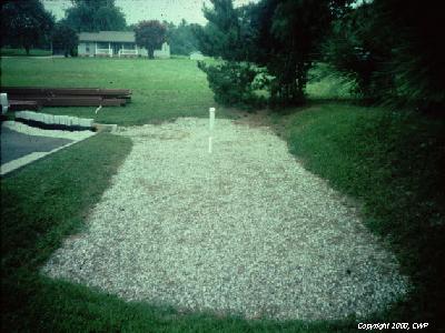 This slide shows an infiltration trench receiving runoff from a parking lot. Note the PVC observation well and clean out in the background. This particular example lacks adequate pretreatment (a common problem with many practices installed in the field).