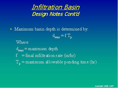 An infiltration basin maximum depth is based on the same principles as an infiltration trench. However, because the basin uses an open area or shallow depression for storage, the maximum allowable depth is a function of maximum allowable ponding time instead of storage time.