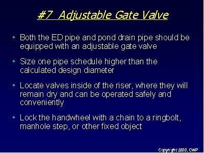 Gate valves are used on the pond drain to drain the pond in emergency situations, or for emergency access. On the ED outlet, gate valves are used to provide the equivalent diameter necessary to provide the required detention time.