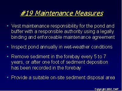 An often forgotten, but critically important, feature of all stormwater treatment practices is maintenance. Identifying a responsible party and schedule of maintenance measures is necessary for long term performance of the facility. Some maintenance considerations for ponds and wetlands are presented above.