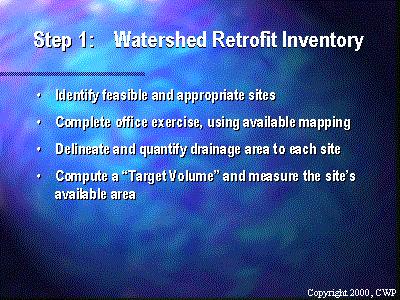Two important office tasks need to be conducted during this step. First, the drainage area to each retrofit should be delineated and second, the potential surface area of the facility measured. The drainage area is used to compute a capture ratio. This is the percentage of the overall watershed that is being managed by all retrofit projects. The surface area is used to compute a preliminary storage volume of the facility. A short cut storage volume can be computed by multiplying two-thirds of the facility surface area times an estimated depth. These two bits of information can be used as a quick screening tool. In general, an effective retrofitting strategy must capture at least 50% of the watershed and a minimum target storage volume for each retrofit is approximately � inch per impervious acre.