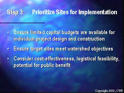 Once sites have been located and determined to be feasible and practical the next step is to set up a plan for future implementation. Even the best stormwater retrofitting programs have limited capital budgets for individual project design and construction. Therefore it is prudent to have an implementation strategy based on a prescribed set of objectives. For example, in some watersheds, implementation may be based on a strategy of reducing pollutant loads to receiving waters where the priority of retrofitting might be to go after the "dirtiest" land uses first. Whereas if the strategy is oriented more towards restoring stream channel morphology, priority retrofits are targeted to capture the largest drainage areas and provide the most storage. Whatever the restoration focus, it is useful to provide a scoring system that can be used to rank each retrofit site based on a uniform criteria. A typical scoring system might include a score for the following items:
