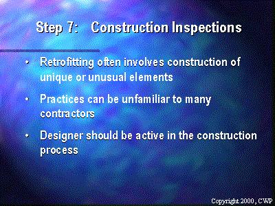 Like any major design project, proper construction inspection and administration is integral to a successful facility. For retrofit projects, this is even more so. Retrofitting often involves construction of unique or unusual elements, such as flow splitters, underground sand filters, or stream diversions. Many of these practices are unfamiliar to many contractors. Most publicly funded projects are awarded to the low bidder who may be qualified to do the work, but has never constructed projects of this nature before. Therefore, it is almost a necessity to retain the original retrofit designer or other qualified professional to answer contractor questions, approve shop drawings, conduct regular inspections, hold regular progress meetings, conduct construction testing, and maintain construction records.